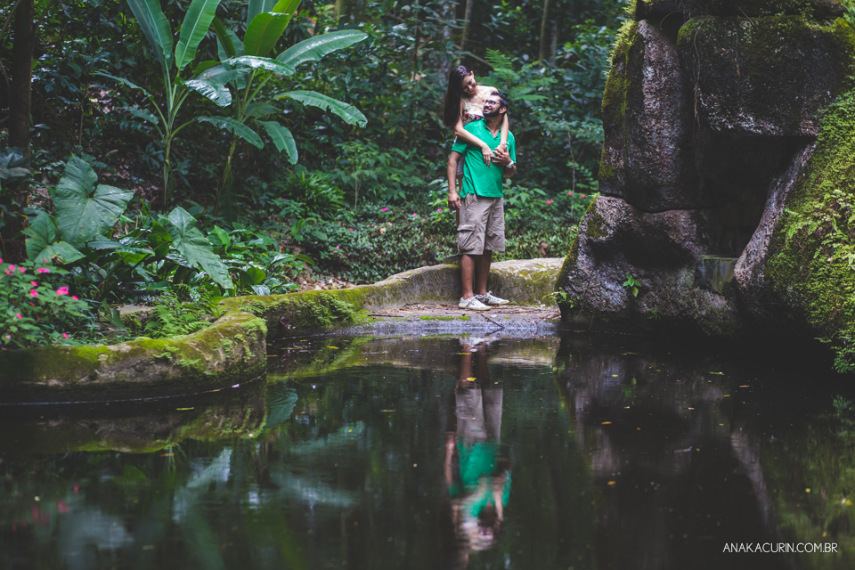 Homem recostado em muro de pedra coberto de musgo verde em desfoque, enquanto sua noiva dança ao longe na beira de um lago. Fotografia de casal feita por Ana Kacurin no Rio de Janeiro - RJ.